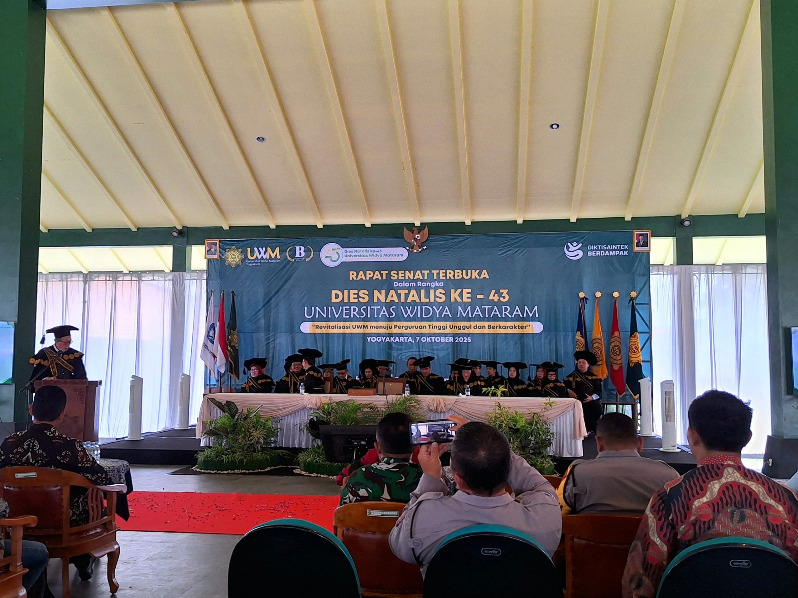 Universitas Widya Mataram (UWM) Yogyakarta menyelenggarakan Sidang Senat Terbuka dalam rangka Dies Natalis ke-43 di Pendopo Agung Kampus Terpadu Banyuraden pada Selasa (7/10). Acara yang mengusung tema “Revitalisasi Universitas Widya Mataram Menuju Perguruan Tinggi Unggul dan Berkarakter” ini menjadi momentum penting untuk merefleksikan capaian kinerja universitas sepanjang tahun akademik 2024/2025 sekaligus merumuskan langkah strategis ke depan. Rektor Universitas Widya Mataram, Prof. Dr. Edy Suandi Hamid, M.Ec., dalam pidatonya menyampaikan rasa syukur atas keberlangsungan kampus selama 43 tahun, sembari menegaskan komitmen UWM untuk terus berperan sebagai pusat pendidikan berbasis budaya yang unggul dan berdaya saing.